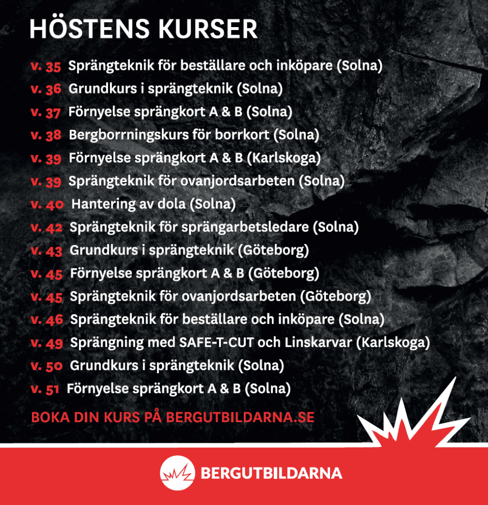 Bergutbildarna är ledande inom berg- och sprängtekniska utbildningar. Vi håller kurser runtom i Sverige och företagsanpassar kurser för entreprenörer, leverantörer och myndigheter. För att komma i kontakt med Bergutbildarna eller boka en kurs: